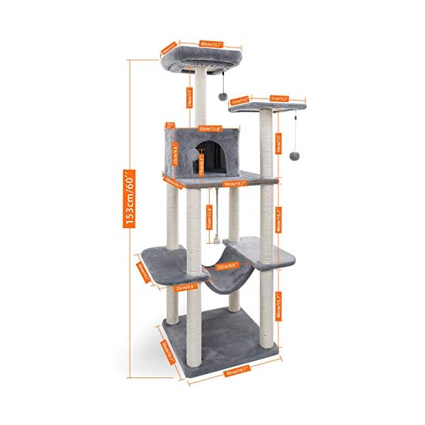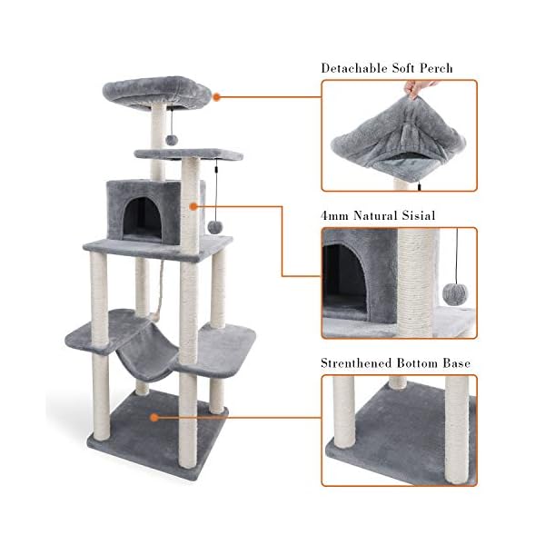 Alles in einem Entspannungs-Spot: Eine geräumige Höhle, eine weiche Hängematte und mehrere Sitzstangen sorgen für einen exklusiven Rückzugsort für Ihre Katze. Es bietet luxuriöse Napping-Erfahrung und Sicherheitsgefühle. Die Abdeckung des Deckbarsch ist abnehmbar und waschbar. Sie können es als weiteres Katzenbett verwenden. Speziell hinzugefügte Ballspielzeuge und Seile sorgen für mehr Unterhaltung.