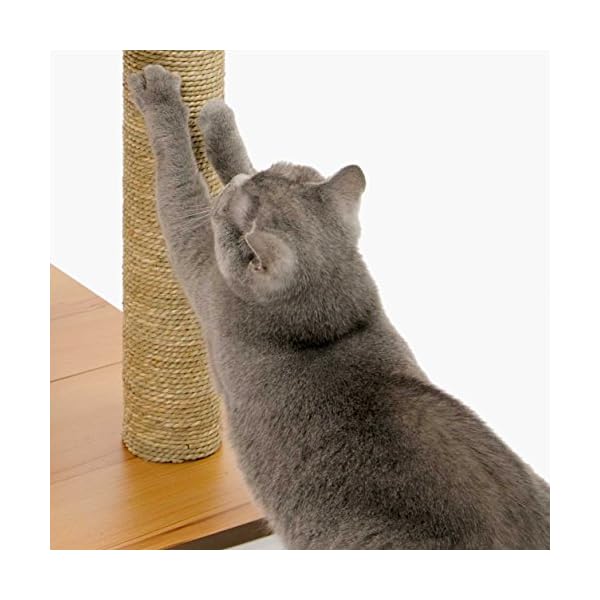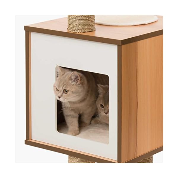 Vesper ist eine außergewöhnliche Katzenmöbel-Serie in zeitlosem, modernem Design. Katzen sind anspruchsvolle Wesen. Ihre Besitzer auch. Anspruch an das Design, die Materialien und die Verarbeitung prägen das Bild von Vesper. Basis jedes Katzenmöbels ist eine Kubus-Höhle, welche je nach Modell von Plattformen, weiteren Kuben und Kratzflächen mit mindestens 80 cm Höhe ergänzt wird. Kissen mit Memo-Foam-Effekt und unterschiedlichen Textiloberflächen schmeicheln der Katze und lassen Vesper zu einer einzigartigen Spiel-, Erholungs- und Ruhezone werden. Animierend wirken die verschiedenen Spielzeuge von Vesper. Hängend an einer stabilen Alu-Spielzeughalterung angebracht locken sie die Katze zum Spiel oder werden zum Ausgangspunkt einer spannenden Jagd. Die High Base Variante der Vesper Katzenmöbel-Linie besticht durch seine Höhe und ist Ausguck und Rückzugsort in einem. Die langen schlanken Seegras-Säulen animieren zum ausgiebigen Kratzen in gestreckter Haltung. Die Kubus-Höhle mit Hinterausgang lädt zum Schlummern ein. Details – Kubus-Höhle mit zwei Plattformen – MDF aus neuseeländischer Kiefer gefertigt, mit Walnussdekor-Laminat – Verwendung von Lacken auf Wasserbasis – Cremeweiße Baby-Plüsch-Kissen mit Memo-Foam-Effekt und Kratzflächen aus Sisal, mit Klett für ein einfaches Abnehmen – Kratzsäulen mit naturfarbenem Seegras umwickelt – Hängendes Kugelspielzeug aus braunem Rattan, lässt sich leicht austauschen Besonderheiten – Gerundete Ecken und Kanten für eine sichere und angenehme Haptik – Stabile Konstruktion – Einfache Montage