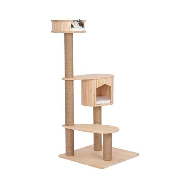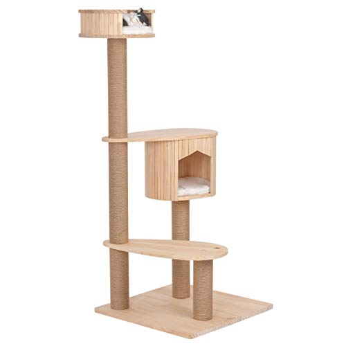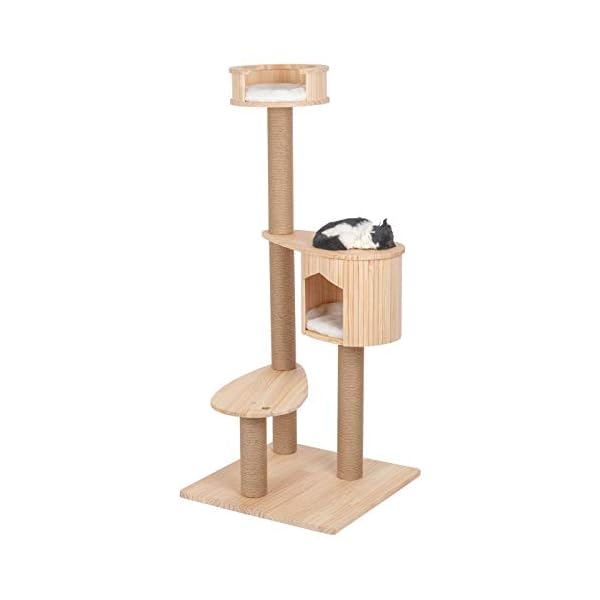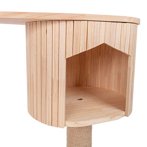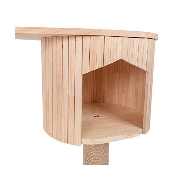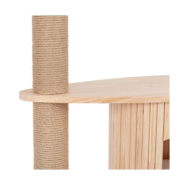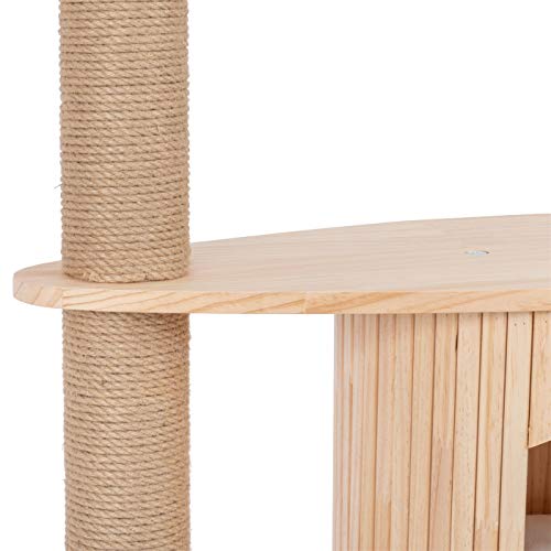 Ob Schlafhöhle als Rückzugsort oder offene Liegefläche – der Premium Kratzbaum „Isabel“ aus unbehandeltem Kiefernholz bietet mit seinen extravaganten Details und dem natürlichen Design, alles was sich Katzen und Katzenbesitzer wünschen.